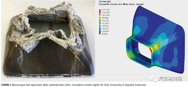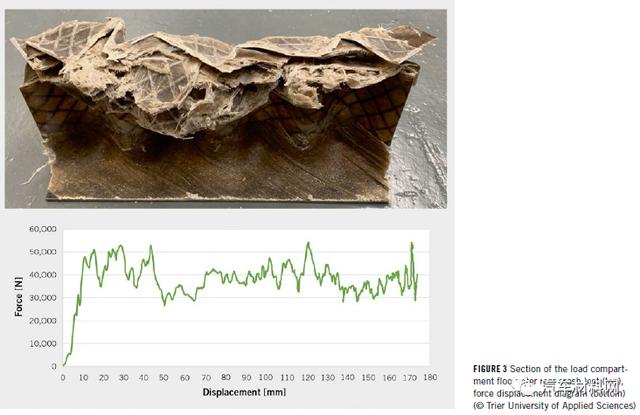 亞麻纖維的比重比碳纖維低,而強度和彈性模量值與玻璃纖維相似。由于它們僅需要大約1-5%的能量輸入,在生產(chǎn)過程中會顯著降低CO2排放,因此車輛的整體能量平衡性具有優(yōu)勢。亞麻纖維增強組件在減振、發(fā)生碰撞時的碎裂行為方面提供了顯著優(yōu)勢,并且沒有有害的纖維粉塵,方便處置或回收利用。目前,NFRP材料用于高應(yīng)力部件的可靠材料數(shù)據(jù)和經(jīng)驗相對較少。因此,該項目的主要致力于確定材料特性并進一步開發(fā)尺寸標注方法。通過使用有限元方法(FEM)進行計算,可以實現(xiàn)結(jié)構(gòu)優(yōu)化,對其中涉及到的纖維層數(shù)、鋪層方向和順序進行模擬,通過靜態(tài)和動態(tài)載荷測試進行了驗證(具體如圖2)。在考慮前、后和側(cè)面碰撞安全性時,NFRP制成的部件可通過管狀或波浪形結(jié)構(gòu)的壓碎實現(xiàn)約30kJ/kg的比能量吸收,這是傳統(tǒng)鋼制碰撞盒比能量吸收的兩倍左右,具體測試結(jié)果如圖3所示。