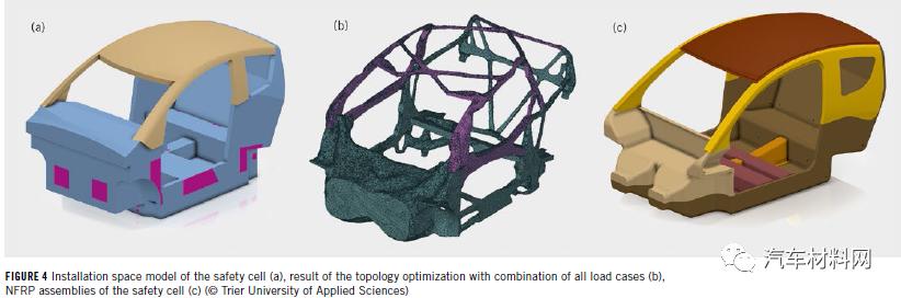 SafetyCell安全車身結(jié)構(gòu)原型如圖4(a),它是根據(jù)不同身材乘員的人體工程學(xué)研究而開發(fā)的,并考慮了驅(qū)動器和底盤結(jié)構(gòu)的優(yōu)化。接下來,基于前、后、側(cè)面碰撞可能帶來的碰撞載荷的路徑,進行拓撲優(yōu)化,如圖4(b)。最后,考慮亞麻纖維增強復(fù)合材料的結(jié)構(gòu)(如纖維角度、鋪層等),進一步轉(zhuǎn)換為圖4(c)。