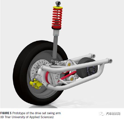 該車采用了后輪驅(qū)動,其優(yōu)點主要包括:可以在駕駛和車輛啟動時進行扭矩矢量控制,從而確保即使在后軸單獨電動制動時,車輛也可以在中等橫向加速度下保持穩(wěn)定。這意味著可以完全省去后輪上的機械制動器,進一步減少了能源需求。該驅(qū)動系統(tǒng)是通過驅(qū)動裝置的擺臂實現(xiàn)的,擺臂作為帶有懸架支柱的拖臂同時接管車輪的導(dǎo)向裝置,在乘用車中是一種新穎設(shè)計,具體如圖5。緊湊的水冷式發(fā)動機位于由控制臂驅(qū)動的旋轉(zhuǎn)軸附近,與輪轂電機相比,這大大減少了非懸掛的質(zhì)量,并且由于車輪的垂直加速度而導(dǎo)致的機械應(yīng)力更低。為了通過V形皮帶將扭矩和速度傳遞至驅(qū)動輪,該車采用了合作伙伴Continental的P0混合動力驅(qū)動裝置進行改裝。目前用于測試的驅(qū)動裝置原型為開放式管狀結(jié)構(gòu),項目組將更改為由鑄鋁制成的封閉式控制臂結(jié)構(gòu)。